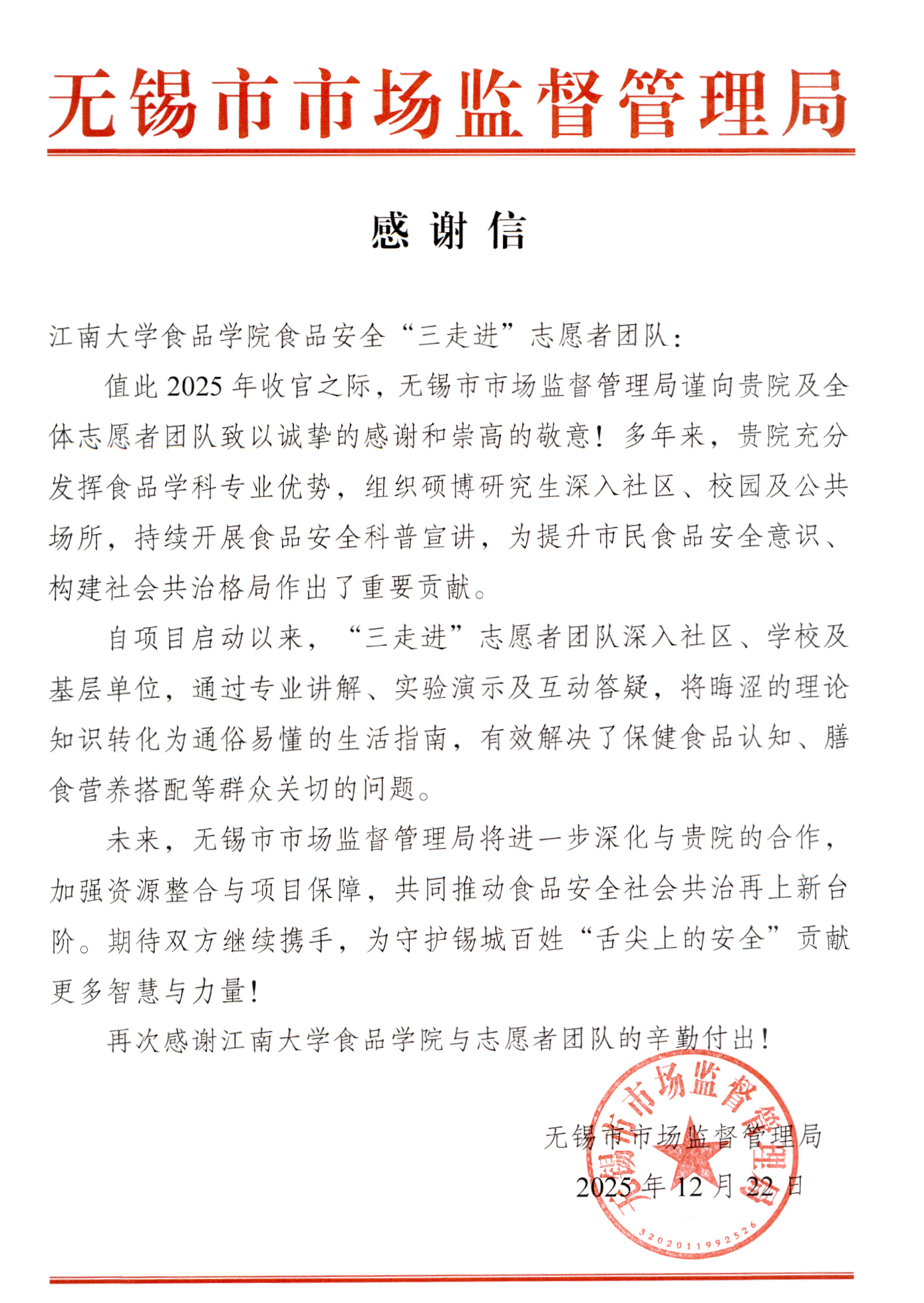 团队与无锡市市场监督管理局长期以来保持着紧密的合作关系。近日,市局特别向学院及全体志愿者团队发来感谢信,对双方在食品安全社会共治方面的协作成果给予充分肯定。感谢信是对我们双方携手服务社会、共建食安防线工作的生动注脚,也为未来的合作注入了更强的信心。展望新征程,希望糖心vlog