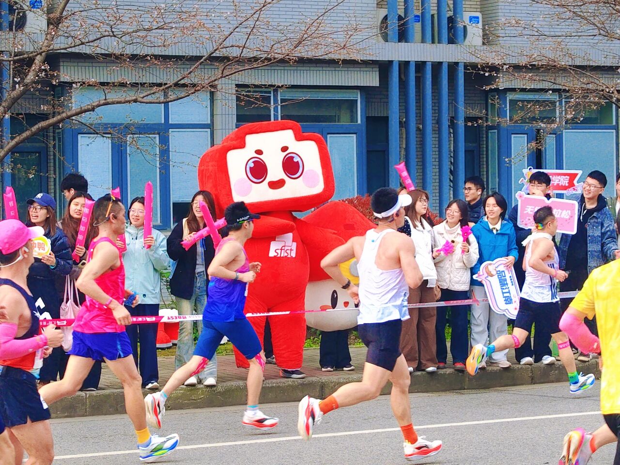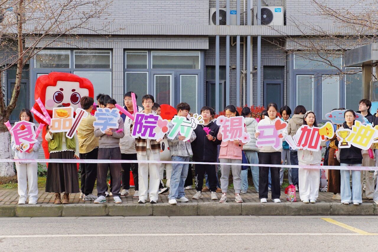 “‘食’力护航,锡马飞扬!江南食品,领跑未来!”嘹亮的口号响彻校园上空。食品学子手持加油气球棒与拍手板,以最饱满的热情为每一位参赛选手呐喊助威。人群中,学院吉祥物“品小敢”“食小鲜”频频与跑者热情互动,成为赛道旁一道亮丽的风景线。